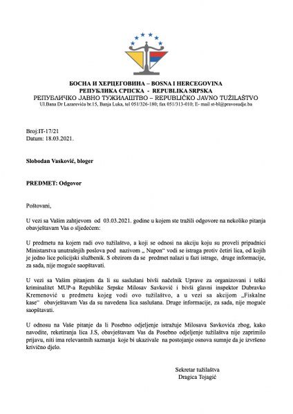 U vezi sa Vašim pitanjem da li su saslušani bivši načelnik Uprave za organizovani i teški kriminalitet MUP-a Republike Srpske Milosav Savković i bivši glavni inspektor Dubravko Kremenović u predmetu kojeg vodi ovo tužilaštvo, a u vezi sa akcijom ‘Fiskalne kase’ obavještavam Vas da su navedena lica saslušana. Druge informacije, za sada, nije moguće saopštavati.