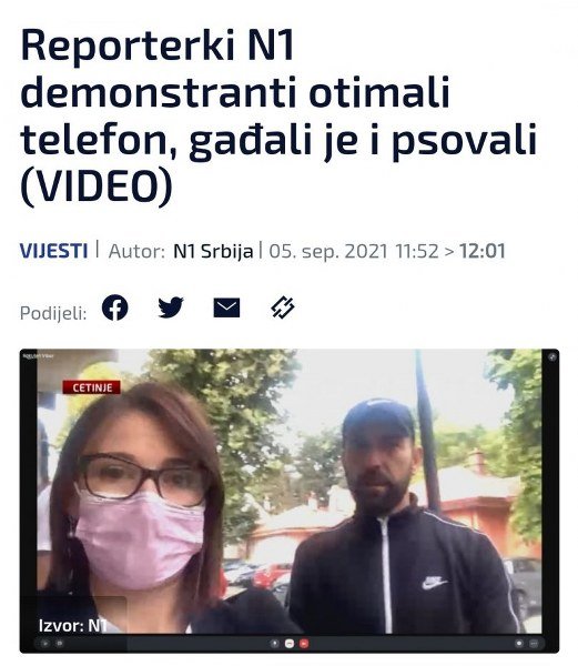 Sramno je što je grupa tzv „komita“, crnogorskih ekstremista i ultranacionalista, pristalica Mila Đukanovića, danas na Cetinju prvo gađala kamenjima a potom napala novinarku Aleksandru Tolj Ružić i ekipu N1 televizije, otela telefon i opremu i tako onemogućila da rade svoj posao.