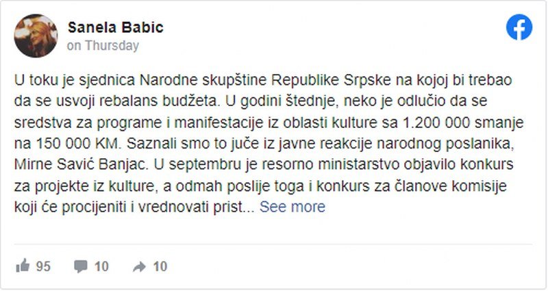 Babić je istakla da je u septembru Ministarstvo kulture i prosvjete RS objavilo konkurse za projekte iz kulture, a zatim i članove komisije koji će procijeniti i vrednovati pristigle projekte. Već u novambru, odnosno prije par dana, uslijedio je hladan tuš.