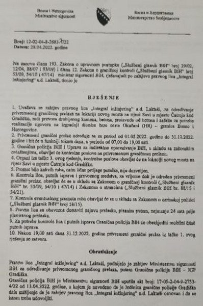 Ipak, niko da objavi, niti se na službenim stranicama Ministarstva bezbjednosti Bosne i Hercegovine, Granične policije BiH ili Uprave za indirektno oporezivanje može pronaći informacija da je ministar Selmo Cikotić prije par dana odobrio zahtjev dvorske neimarske firme „Integral inžinjering“ a.d. Laktaši, te na lokaciji novog mosta na rijeci Savi u mjestu Čatrnja kod Gradiške odredio privremeni granični prelaz, radi prevoza drobljenog kamena, betona i asfalta za potrebe ralizacije ugovora na izgradnji brze ceste, i to za period od 01.05. do 31.12.2022.godine, a koji će biti u funkciji svakog dana od 07 do 19 časova.