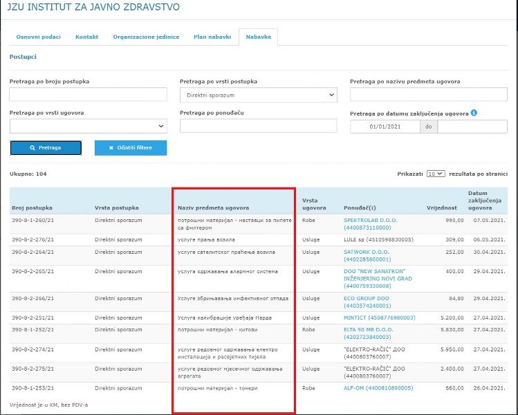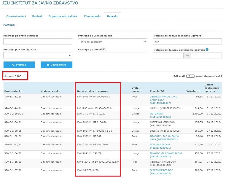 Šest godina, 3.388 direktno sklopljenih ugovora i više od dva miliona netransparentno potrošenih maraka bilo je potrebno Institutu za javno zdravstvo Republike Srpske da shvati da se poslovi namijenjeni firmama putem netransparentnih direktnih sporazuma ne smiju podvoditi pod oznaku „kuf“, već da predmet javne nabavke mora da bude jasno definisan.