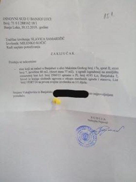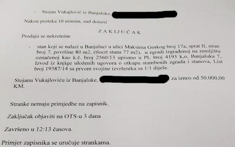 4. Stan je otišao na doboš zbog ranijeg duga njegovog sada već bivšeg vlasnika od 15.000 KM; Vukajlović je stan platio 50.000 KM, odnosno trećinu procijenjene vrijednosti, koja je iznosila 150.000 KM.