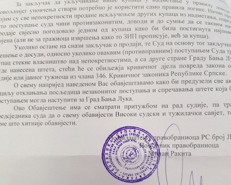 Iz Pravobranilaštva su, 20.01.2020., uputili Obavještenje Osnovnom sudu u Banjaluci kojim traže poništenje licitacije, na kojoj je došlo do namještene prodaje, kojom je Grad oštećen za 256.010 KM (vidi dodatak). Gdje je krivica Pravobranilaštva? U činjenici da nisu prisustvovali namještenoj licitaciji, 31.12.2019. godine, iako su o datumu njenog održavanja bili uredno obaviješteni, 10.12.2019. godine.