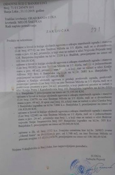 2. Već sam objavio da je Vukajlović, 31.12.2019. godine u samo deset minuta, Tačno u Podne, kupio na licitaciji u banjalučkom Osnovnom sudu četiri stana, poslovni prostor u Banjaluci, kao i vikendicu sa 1,3 dunuma okućnice u Ivanjici, u neposrednoj blizini grada, za samo 283.400 KM; Takvom namještenom licitacijom, koja je, suštinski, kriminalni akt, Grad, koji je u pomenutom slučaju bio tražilac izvršenja, oštećen je za 256.010 KM.