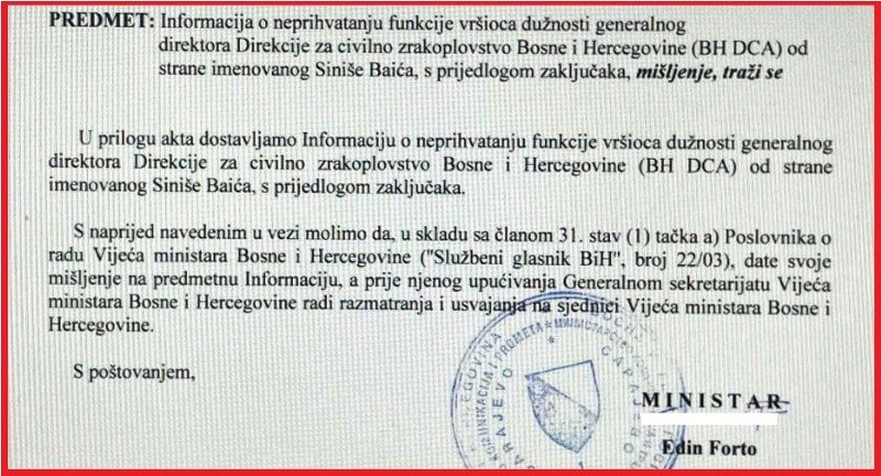 Baić je u međuvremenu obavijestio Savjet ministara da ne prihvata dužnost. Pojasnio je da je on trenutno pilot helikoptera u Oružanim snagama BiH, od kojih nije uspio da dobije saglasnost za regulisanje, odnosno zamrzavanje svog statusa u toj instituciji za vrijeme u kojem je trebalo da bude na čelu BHDCA-a.