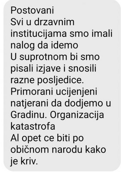 Hiljade djece i učenika stajalo je u kolonama jer zbog loše organizacije i propusta nisu uspjeli doći do Donje Gradine a prešli su skoro 1000 kilometara za dan, kako bi Uzurpator pokazao lažnu moć a djeca, učenici i radnici u javnoj upravi, koji su na silu popisani i natjerani da dođu u Donju Gradinu, bili pijuni i dekor u njegovoj predstavi. Tužno je što on priča o slobodi, a većina okupljenih su robovi koji moraju da slijede Slijepog vođu na putu do provalije, ponižavaju se za posao, pripravnički, sendvič i flašicu vode jer su iz nevolje, bijede i siromaštva, u koji ih je gurnuo, primoranu da upadnu u njegovu zamku i korupcionašku mrežu.