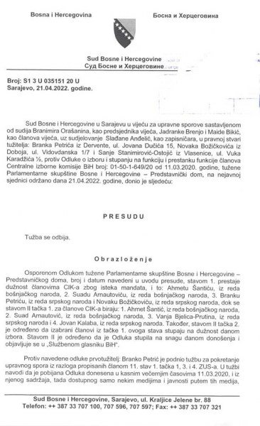 Podsjećamo, u martu 2020. godine Predstavnički dom PS BiH je imenovao Vanju Bjelicu Prutinu, Jovana Kalabu, Suada Arnautovića i Ahmeda Šantića za članove Centralne izborne komisije BiH nakon što je, prehodno, istekao mandat Branku Petriću, Novaku Božičkoviću, Suadu Arnautoviću i Ahmedu Šantiću. Parlamentarne komisije su kasnile sa procedurom i kandidatskom listom što je ostavilo mogućnost Predstavničkom domu PS BiH da imenuje navedene članove. Petrić je, potom, podnio tubu Sudu BiH tražeći poništavanje imenovanja. No, Sud BiH ga je odbio. Na ovu odluku se ne može izjaviti redovna žalba, ali se može pokrenuti vanredni pravni lijek u roku od 30 dana.