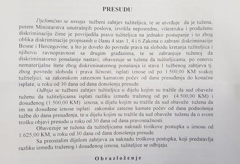 Sud je utvrdio da je MUP Republike Srpske neposredno, višestruko i produženo diskriminisao, a što je dovelo do povrede prava na slobodu kretanja i njihovu ravnopravnost sa drugim građanima – navedeno je u presudi.