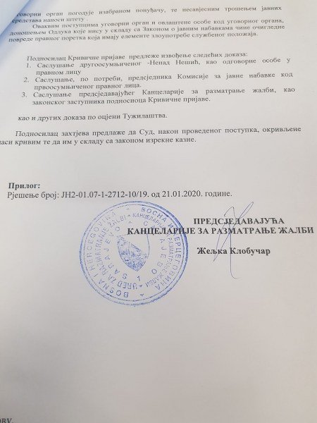 Da podsjetim, Krivičnu prijavu protiv Nešića podnijela je Kancelarija za žalbe BiH 21.01.2020. godine zbog nepostupanja po izričitim nalozima te Kancelarije, kao i presudama Suda BiH.