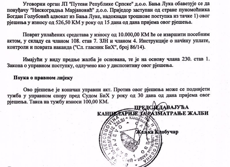 Na taj ugovor žalila se firma “Niskogradnja Marjanović”, koja je za iste poslove imala za 12 miliona KM manju ponudu.