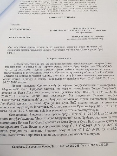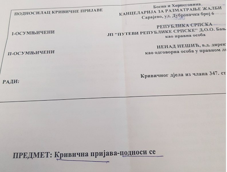 Kancelarija za razmatranje žalbi BiH (KRŽ) podnijela je Tužilaštvu krivičnu prijavu protiv JP “Putevi” RS i Nenada Nešića, v.d. direktora tog preduzeća, zbog nepostupanja po izričitim nalozima te Kancelarije, kao i presudama Suda BiH.