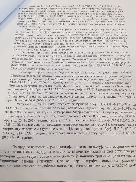 Prema pisanju tih medija, prijavu Okružnom javnom tužilaštvu Banjaluka podnijela je Kancelarija za razmatranje žalbi BiH u vezi sa postupkom javnih nabavki za zaštitu i redovno održavanje regionalnih i magistralnih puteva iz oblasti jedan.