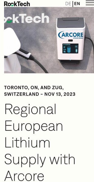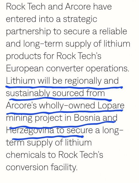 - Rock Tech i Arcore su ušli u strateško partnerstvo kako bi osigurali pouzdano i dugoročno snabdijevanje litijumskim proizvodima za evropske operacije pretvarača kompanije Rock Tech. Litijum će se regionalno i održivo nabaviti iz Arcore-ovog rudarskog projekta Lopare u Bosni i Hercegovini u potpunom vlasništvu kako bi se osigurala dugoročna snabdjevenost litijumskim hemikalijama u Rock Tech-ovom pogonu za obradu.