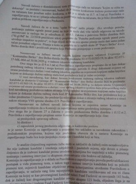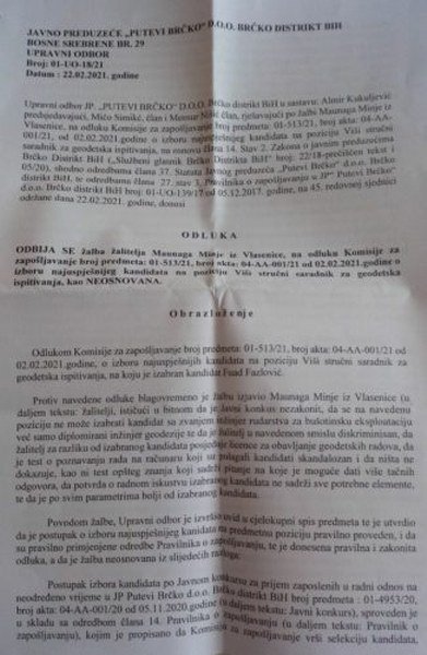 Ovo je reagovanje Javnog preduzeća Putevi Brčko Distrikta na istup inženjera Minje Maunage i optužbe za namještanje konkursa za pomenuto radno mjesto.