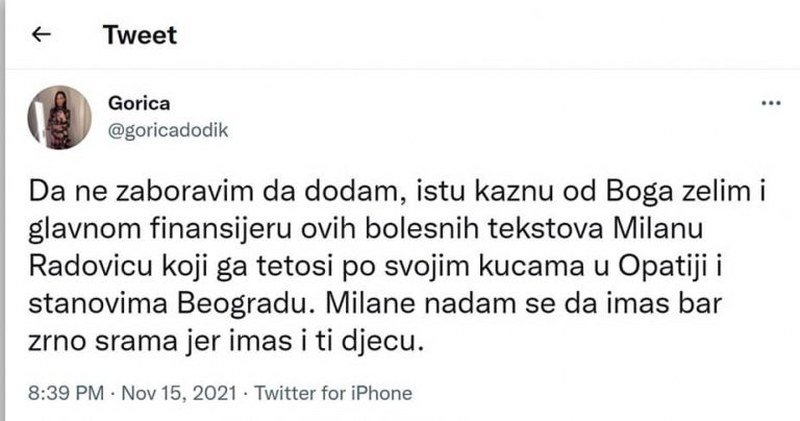 Perfidno manipulišući i optužujući me da stojim iza napada na Vašu porodicu, vi pominjete moju djecu i stavljate metu na moju porodicu. To je, gospođo Gorice, maliciozno, ispod svakog nivoa i daleko više govori o Vama nego što mislite – ne samo o pristojnosti i vaspitanju, nego i o Vašim namjerama.