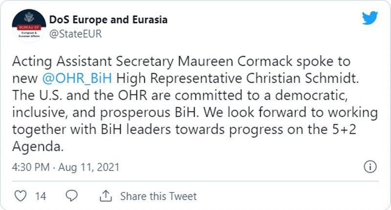 Glavna zamjenica pomoćnika državnog sekretara Sjedinjenih Američkih Država Maureen Cormack razgovarala je danas s novim visokim predstavnikom u našoj zemlji Christianom Schmidtom.