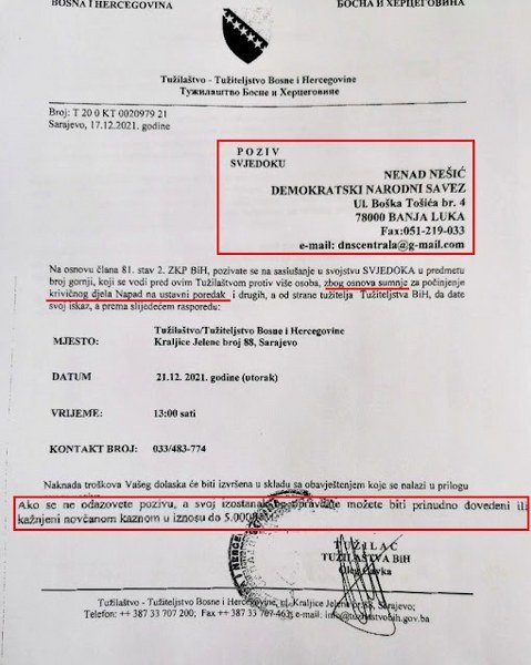Entitetsko rukovodstvo odlično zna kakva prevara je ovde u pitanju i zato se pretvaraju slijepima i nijemima oko aktuelnih dešavanja, dok Selak, Šarović, Nešić i Borenović ispoljavaju "kooperativnost" sa Tužilaštvom BiH. U pozivima (vidi donji foto) koje im šalje tužilac Čavka stoji prijetnja da u slučaju neodazivanja mogu biti privedeni i kažnjeni novčano do 5 000 KM, što i jeste suštinski motiv njihovog dolaženja u Tužilaštvo BiH. Po izjavama koje daju medijima vidi se da nemaju jasnog stava oko spornih dešavanja, na šta su Dodik i Čavka unaprijed računali kada su ih izvrgli "svjedočenjima". Kasnije, tokom izborne kampanje, stići će im na naplatu današnje nesnalaženje.