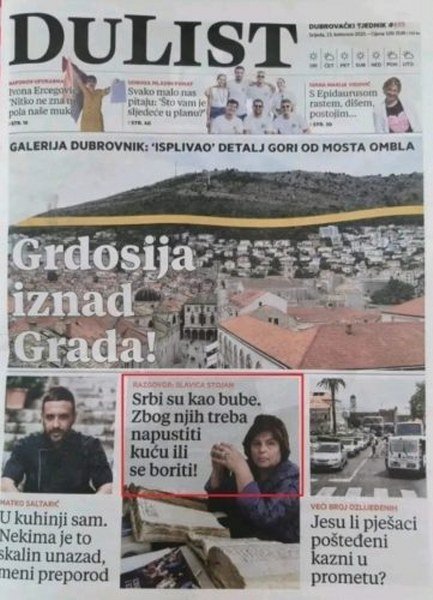 Iako su Srbi praktično u potpunosti nestali u Hrvatskoj u 20-om vijeku, pobijeni, pokatoličeni ili protjerani sa vjekovnih ognjišta tokom vladavine Pavelića i Tuđmana, malobrojni koji su ostali su građani drugog reda i me smiju da pisnu, srbofobija i mržnja nažalost ne prestaje. To potvrđuje i sramni intervju koji je nedeljniku Dubrovački list dala Slavica Stojan, redovni profesor istorije na Sveučilištu u Zagrebu i predsjednica Matice Hrvatske u Dubrovniku.