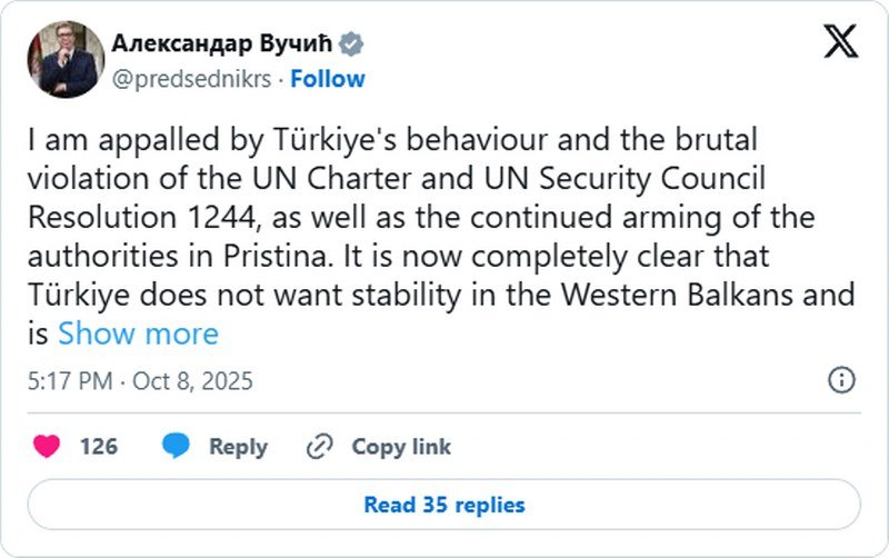 "Zgrožen sam ponašanjem Turske i brutalnim kršenjem Povelje UN i Rezolucije 1244 Saveta bezbednosti UN, kao i kontinuiranim naoružavanjem vlasti u Prištini. Sada je potpuno jasno da Turska ne želi stabilnost na Zapadnom Balkanu i da ponovo sanja o obnovi Osmanskog carstva. Srbija je mala zemlja, ali razumemo njihove prave namere", napisao je Aleksandar Vučić.