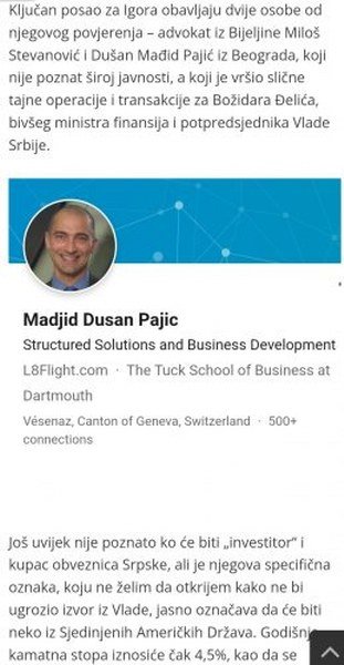 Ključan posao za Igora obavljaju dvije osobe od njegovog povjerenja – advokat iz Bijeljine Miloš Stevanović i Dušan Mađid Pajić iz Beograda, koji nije poznat široj javnosti, a koji je vršio slične tajne operacije i transakcije za Božidara Đelića, bivšeg ministra finansija i potpredsjednika Vlade Srbije.