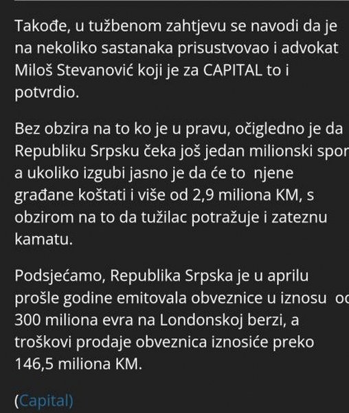 Ova Tužba potvrđuje da su istinite informacije koje sam objavio prošle godine da (polu)tajnom operacijom zaduženja Republike Srpske na Londonskoj berzi rukovodi Igor Dodik, davajući instrukcije ministarki finansija Zore Vidović, a sve je išlo preko dvorskog advokata porodice Dodik Miloša Stevanovića, inače direktora DNS-a, i Dušana Mejida Pajića.