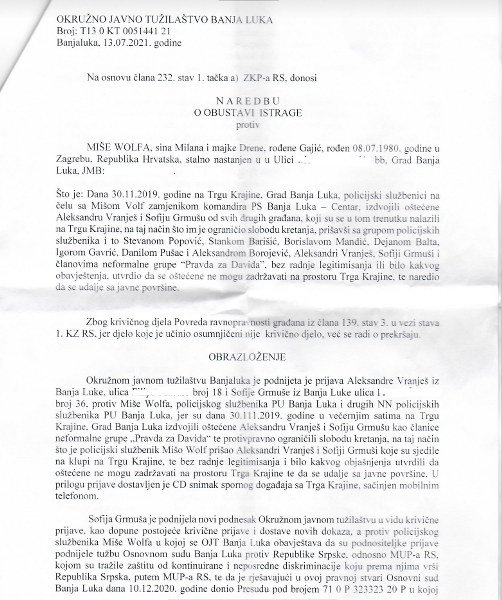 Okružni tužilac Aleksandar Simonović donio je naredbu o obustavi istrage protiv policijskih službenika Policijske uprave Banjaluka protiv kojih su Sofija Grmuša i Aleksandra Vranješ iz neformalne grupe “Pravda za Davida” podnijele krivičnu prijavu zbog krivičnog djela “Povreda ravnopravnosti građana”.