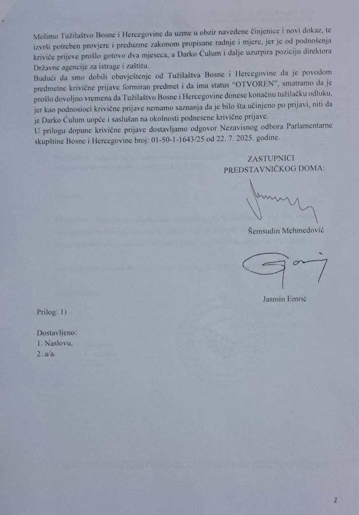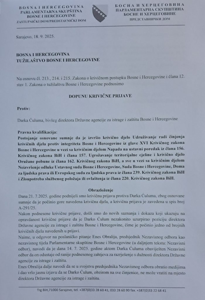 Emrić i Mehmedović su jučer Tužilaštvu BiH uputili dopunu na raniju krivičnu prijavu protiv Ćuluma, jer kako je navedeno u dokumentu upućenom Tužilaštvu BiH u koji je Raport imao uvid, došlo se do 'novih dokaza koji ukazuju na opravdanost krivične prijave da je Darko Ćulum nezakonito uzurpirao poziciju direktora Državne agencije za istrage i zaštitu Bosne i Hercegovine, čime je počinio jedno od brojnih krivičnih djela navedenih u prijavi.'