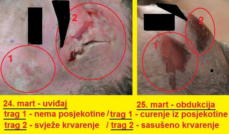 U cilju što manjeg uznemirenja porodice i čitalaca na obje fotografije sam crnom bojom prekrio oko i obrvu, no opet se može vidjeti da je riječ o identičnom dijelu glave. Lijeva fotografija snimljena je 24. marta tokom uviđaja, a desna sutradan tokom obdukcije. I na ovakvom prikazu može se vidjeti na šta je aludirao onaj ko je fotografije objelodanio, a originali daju mnogo veće mogućnosti. Samo su doista uznemirujući za osobe nenaviknute na te stvari.