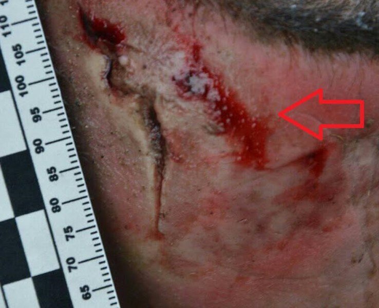 Na gornjoj fotografiji mnogo jasnije se vidi taj veliki hematom na čelu, baš kao i da imamo aktivno krvarenje iz istog (označeno strelicom). Mnogo sam pisao o tome da je doktor Saša Miljković konstatovao ukočenost tijela kakva upućuje na nastupanje smrti nekih šest do devet časova prije toga. Zato je Željko Karan pred anketnim odborom skupštine lagao kako na licu mjesta nije pregledao tijelo, a u čemu ga je demantovao zapisnik o uviđaju inspektora Kojdića u kom stoji da jeste izvršio spoljni pregled.