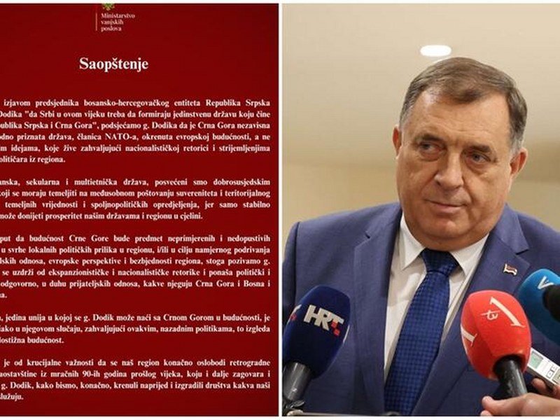 “Kao građanska, sekularna i multietnička država, posvećeni smo dobrosusjedskim odnosima koji se moraju temeljiti na međusobnom poštovanju suvereniteta i teritorijalnog integriteta, temeljnih vrijednosti i vanjskopolitičkih opredjeljenja, jer samo stabilno susjedstvo može donijeti prosperitet našim državama i regionu u cijelini. Nije prvi put da budućnost Crne Gore bude predmet neprimjerenih i nedopustivih komentara u svrhe lokalnih političkih prilika u regionu, i/ili u cilju namjernog podrivanja dobrosusjedskih odnosa, evropske perspektive i sigurnosti regiona, stoga pozivamo g. Dodika da se uzdrži od ekspanzionističke i nacionalističke retorike i ponaša politički i državnički odgovorno, u duhu prijateljskih odnosa, kakve njeguju Crna Gora i Bosna i Hercegovina”, navodi se u saopštenju.