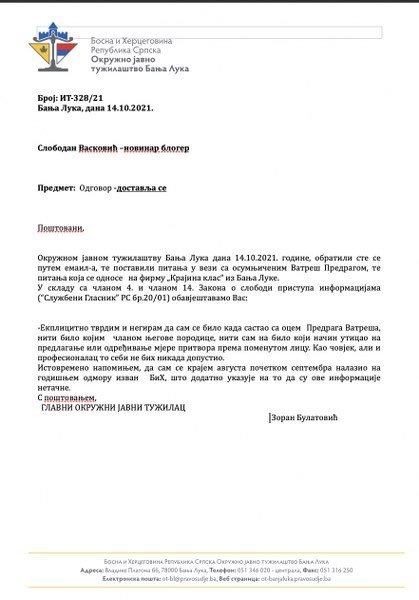 “Okružnom javnom tužilaštvu Banja Luka dana 14.10.2021. godine, obratili ste se putem email-a, te postavili pitanja u vezi sa osumnjičenim Vatreš Predragom, te pitanja koja se odnose na firmu „Krajina klas“ iz Banja Luke.