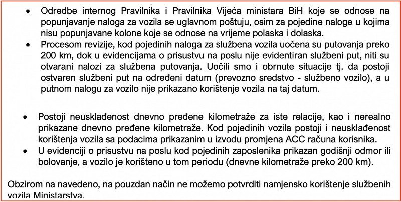 Ovo je navedeno u revizorskom izvještaju za prošlu godinu, a državni revizori su naveli i to da nisu mogli na pouzdan način potvrditi da su u Ministarstvu namjenski koristili službena vozila. Donijeli su zaključak da je Ministarstvo dužno osigurati uredno i dosljedno vođenje svih evidencija na osnovu kojih se može pouzdano potvrditi korištenje službenih vozila za potrebe institucije.