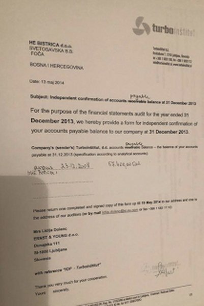 Potvrđuju to i nalazi revizorske kuće “Ernest&Young”, koja je 13.05.2014. godine utvrdila da je “Turboinstitut”/“Kolektor” dužan “HE Bistrica” 57.400 evra, odnosno razliku između uplaćenih 400.000 evra i lažno proknjiženih, preciznije ukradenih, 342.600 evra.