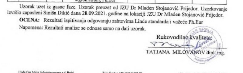 Treba primijetiti i da se firma “Linde”, koja je radila Izvještaje o ispitivanju, ogradila navodeći da se on odnosi samo na uzorak koji im je donešen, nikako na sve količine koje se nalaze u navedenim bolnicama.