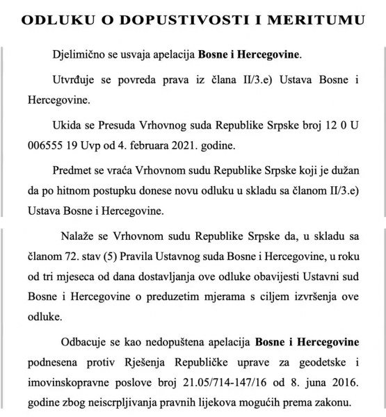 Ustavni sud je, kako je naveo u svojoj odluci, zapazio da je apelanticin (država BiH op. a.) zahtjev za upis promjene posjeda na spornim nekretninama odbijen jer su organi uprave i redovni sudovi zaključili da dokumentacija koju je apelantica priložila uz svoj zahtjev ne može predstavljati pravni osnov za promjenu korisnika u katastarskom operatu.