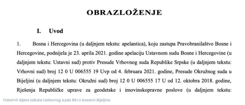 “Ustavni sud je istakao da je apelantica podnošenjem posjedovnih listova nesporno identificirala nekretnine koje su predmet zahtjeva, te je u vezi s tim ukazao na navedene odredbe Zakona i Pravilnika, kao i na Odluku Predsjedništva BiH. Ustavni sud je u tim predmetima zaključio da je Predsjedništvo BiH zakonom ovlašteno da određuje imovinu koja će služiti za potrebe novih Oružanih snaga i da je u tom smislu nadležni organ ovlašten da odlučuje o konkretnim nekretninama”, kaže se u odluci Ustavnog suda BiH.