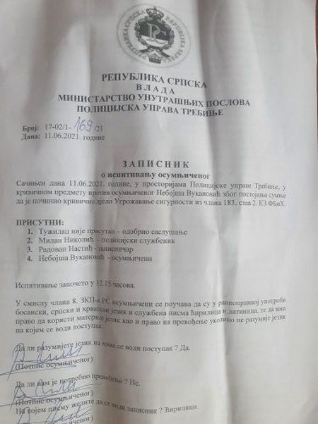 Danas sam u Policijskoj upravi Trebinje saslušan kao osumnjičeni od strane policijskih inspektora za opšti kriminal, a po nalogu Kantonalne policije iz Sarajeva. Protiv mene se vodi istraga kao osumnjičenog zbog navodnog ugrožavanja sigurnosti sudije iz Sarajeva Jasmine Sazdovski.