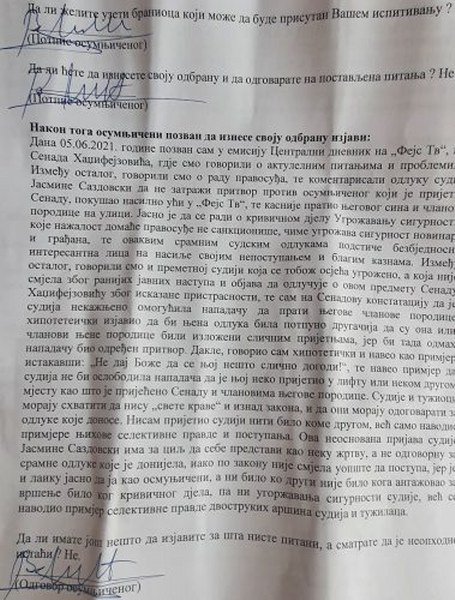 Iako sam naglasio „Ne daj Bože da njoj neko prijeti“ i jasno se upitao hipotetički da li bi sudije oslobodile nasilnika koji prijeti novinarima da su oni u pitanju, ili bi reagovali drugačije i odmah odredile višemjesečni pritvor, čestiti sudija Jasmina je moj natup shvatila kao opasnu prijetnju pa je podnijela krivičnu prijavu za ugrožavanje bezbjednosti, pa sam hitno saslušan i proces je munjevito počeo posle nekoliko dana. Kantonalno tužilaštvo u Sarajevu će nakon mog današnjeg saslušanja odlučiti da li ću biti optužen i procesuiran ili će krivična prijava biti odbačena.