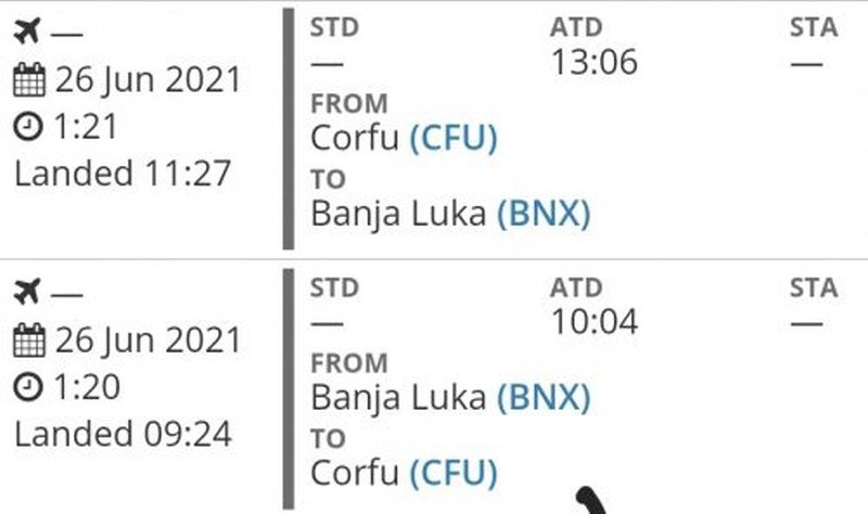 Vukanović je napisao da je avion poletio jutros sa Aerodroma Mahovljani kod Laktaša i Banjaluke u 9:24 a na Krf je sletio u 10:04 po grčkom vremenu.