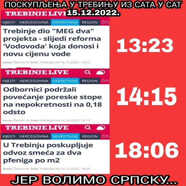 Tako je u Trebinju juče došlo do povećanja poreza na nepokretnosti i imovinu, za nevjerovatnih 80%, te komunalnih usluga i odvoza smeća za 20%, a posle nove godine biće povećani i računi za vodu. Danas stiže i poskupljenje struje, kao šlag na tortu, a Regulatorna komisija za energetiku Republike Srpske, čije je sjedište u Trebinju, usvojiće tarifni postupak i novi model plaćanja, takozvanu blok tarifu, koja će značajno povećati cijenu električne energije za građane.