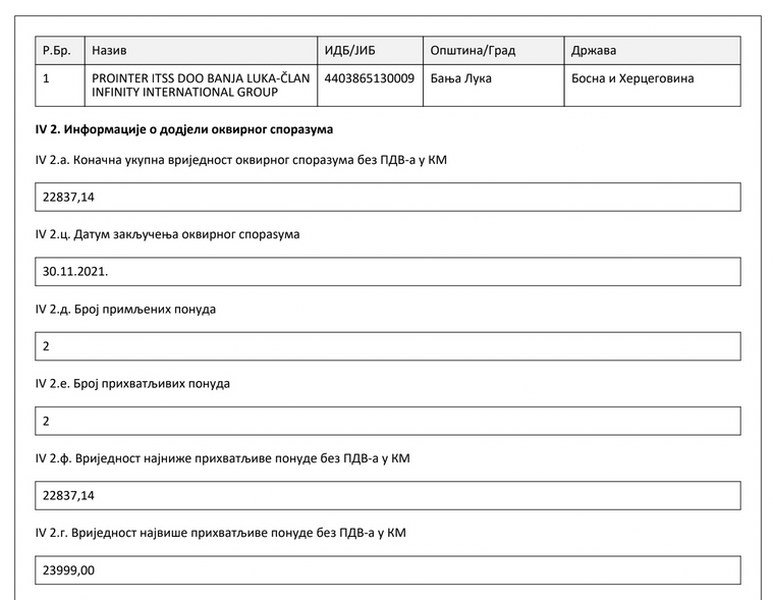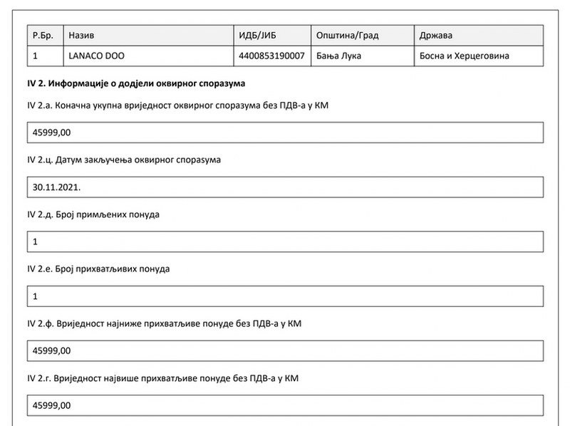 Prvi lot, server i dodatne komponente, procijenio je na 53.820 KM sa uračunatim PDV-om. Nebojša Ninić, jedan od osnivača SNSD-a, u čijem je porodičnom vlasništvu „Lanaco“, samouvjereno šalje ponudu od 53.819 KM. U tenderskoj praksi to zapravo znači da je znao da će biti jedini ponuđač. Polugodišnji okvirni sporazum Kusturić potpisuje 30. novembra 2021.