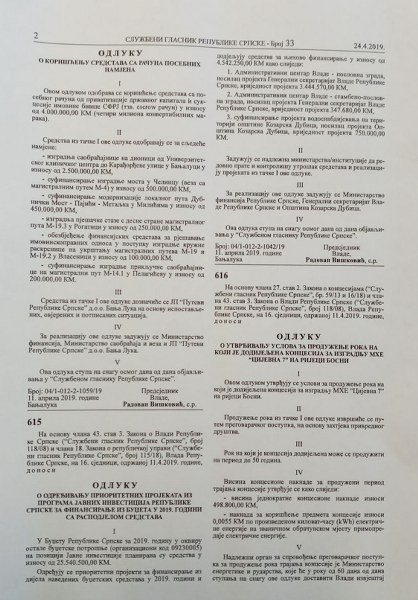 Od toge se, prema Odluci objavljenoj u Službenom glasniku 79/20, za rekonstrukciju puta Ljubinje - Trebinje izdvaja svega 493.223 KM, a za rekonstrukciju puta Drinjača - Milići - Vlasenica 1.900.519 KM. Ni onih Zeleni Jadar - 600 000 KM nisu ostali neokrnjeni, već su skinuti na 568.386 KM. U ovim odlukama je za rekonstrukciju puteva ukinuto ogromnih 19.527.872 KM.