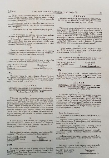 Međutim, na sjednici održanoj 24.07 Vlada RS donosi Odluku o izmjenama pomenute odluke i načinu utroška sredstava. U novoj Odluci koja se objavljuje u Službenom glasniku 74-20, Vlada RS mijenja prethodnu (na 81. sjednici održanoj 24.07.2020.), tako što iznos od 22,49 miliona KM “topi” za cca 3 miliona KM na iznos od 19.405.805 KM.