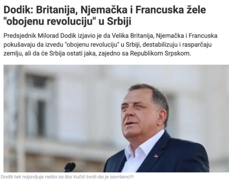 “Milorad Dodik izjavio je da Velika Britanija, Njemačka i Francuska pokušavaju da izvedu obojenu revoluciju u Srbiji, destabilizuju i rasparčaju zemlju, ali da će Srbija ostati jaka, zajedno sa Republikom Srpskom”, javlja danas RTRS.