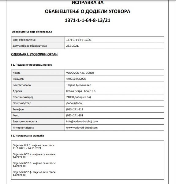 Krajem februara ove godine Vodovod Doboj zaključio je ugovor sa firmom Interkont-Komerc u vrijednosti od 90.000 KM bez PDV-a. Vrlo brzo objavljena je ispravka obavještenja o dodjeli ugovora ovoj firmi. Ispravljena je vrijednost ponude firme sa 90.000 KM na 149.909,30 KM bez PDV-a.