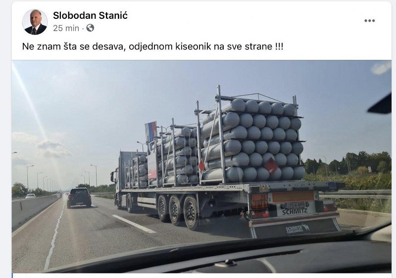 "Ne znam šta se dešava, odjednom kiseonik na sve strane!!!" Ovo je na fejzbuk profilu, uz fotografiju kamiona koji prevozi boce s kiseonikom, objavio Slobodan Stanić, bivši ministar zdravlja Republike Srpske.