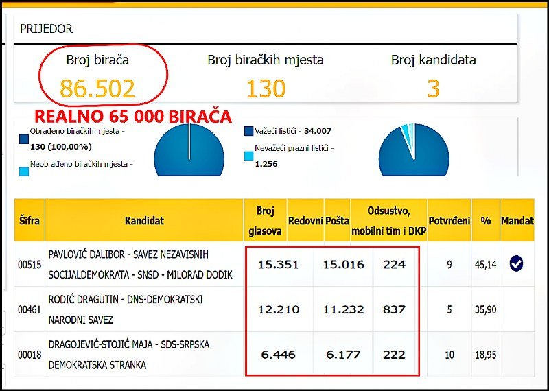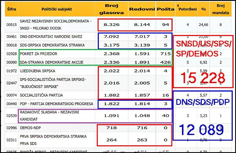 Ovoga puta znamo da je doktorica Maja dio predizbornog tima kandidata "ujedinjene opozicije" i mnoge može u zabludu dovesti sabiranje glasova DNS-a i SDS-a iskazanih na prošlogodišnjim izborima (foto ispod). U pitanju je, ipak, neponovljiva i za predstojeće izbore neprimjenjiva situacija, bar ne za potrebe ozbiljne prognostičke analitike. Vjerujte da je data situacija neupotrebljiva čak i sa pozicije političkog inženjeringa.