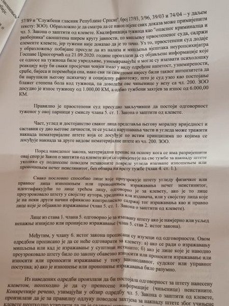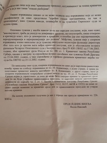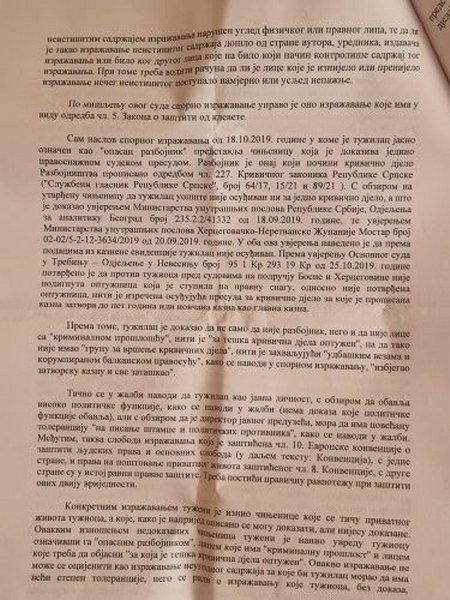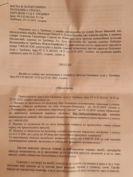 Čestite trebinjske kadije, predvođene predsjednicima Osnovnog i Okružnog suda Milanom Bosićem i Bojanom Stevićem nastavljaju da dijele pravdu globeći me zbog pisanja i svjedočenja istine.