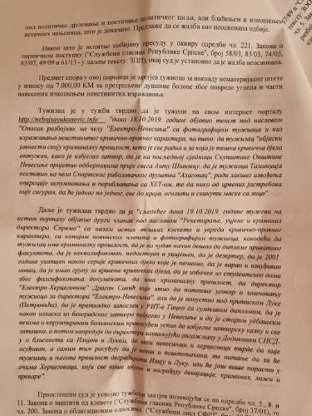 Tako su donijele presudu da direktoru Elektro-Nevesinja Gradimiru Spremu, kadru SNSD-a i Ilije Tamindžije, moram isplatiti skoro 1500 maraka duševnih patnji, jer sam prenio pisanje beogradske štampe iz 2002. godine, kada je bio uhapšen kao student u Beogradu zbog iznuda i ucjena.