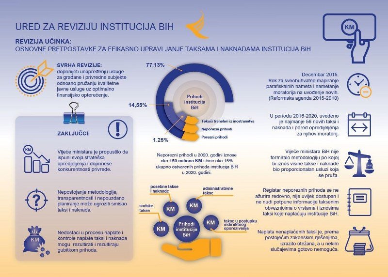 – Rezultati revizije pokazuju da institucije ovu vrstu prihoda planiraju historijski, odnosno da ne postoji određena analiza koja prethodi planiranju prihoda po ovoj osnovi, te da se institucije uglavnom referiraju na rezultate iz prethodnih godina. Nisu sve institucije iz uzorka osigurale da proces naplate taksi i naknada, zasebno ili kao dio nekog drugog procesa, bude prepoznat te da se identifikuju njegovi rizici. Nisu sve institucije iz uzorka vršile ni usaglašavanje naplaćenih i izdatih usluga te sve nemaju akte kojim se uređuje praćenje i kontrola naplate taksi i naknada – kažu revizori.